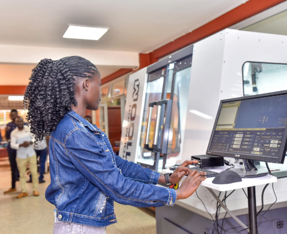 A student operates a CNC Milling Machine within the Makerere University Technology & Innovation Center