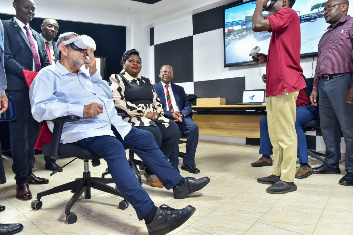 Prime Minister of Saint Vincent and the Grenadines H.E. Ralph Everard Gonsalves explores Virtual Reality technology in the Multimedia Space of the Makerere University Innovation Pod (MUTIC)